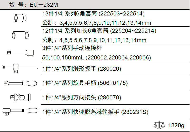 1/4"系列 32件套公制手动套筒扳手组EU-232M