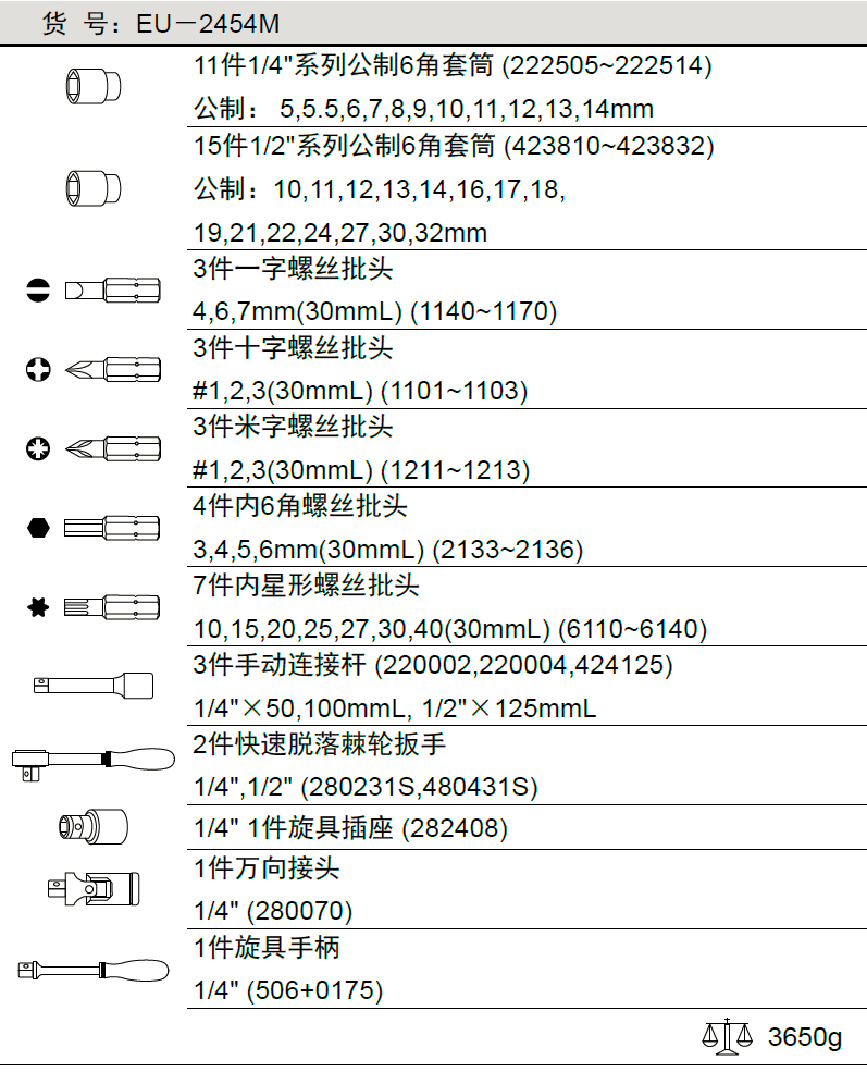 1/4",1/2"系列 54件套公制手动套筒及扳手组EU-2454M