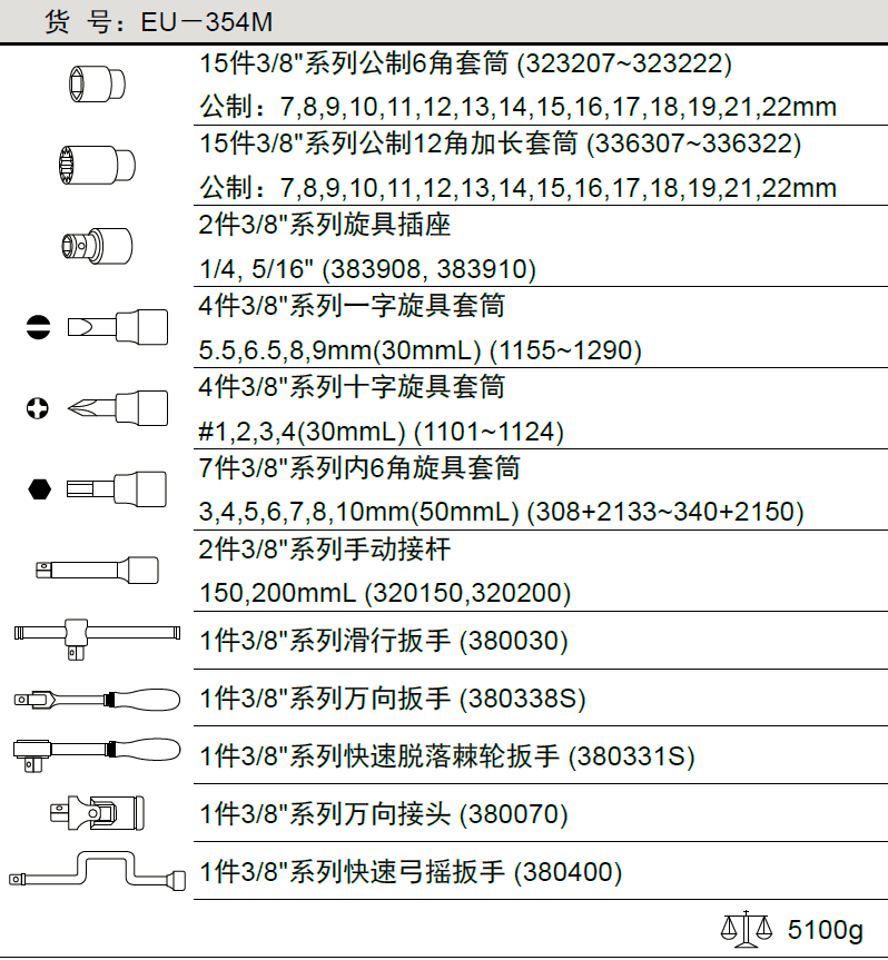 3/8"系列54件套公制手动套筒及旋具套筒和扳手组EU-354M