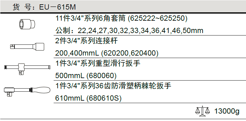 3/4"系列 15件套6角公制套筒扳手组EU-615M