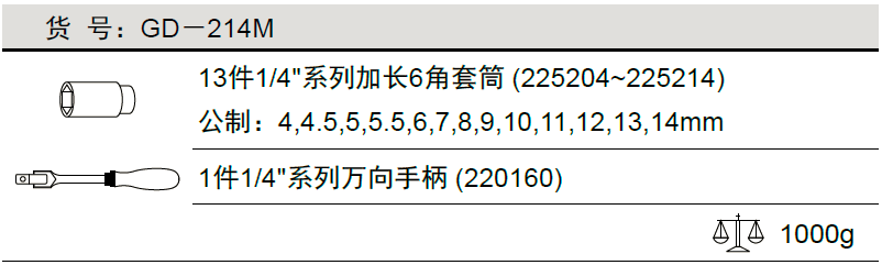 天赋工具1/4"系列 14件套公制套筒起子加长套筒组GD-214M