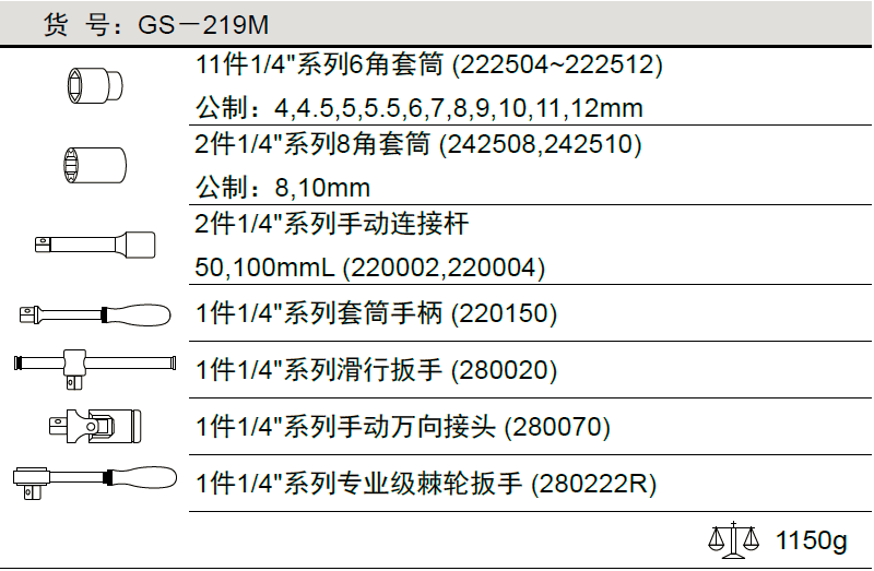 天赋工具1/4"系列19件套公制套筒扳手组GS-219M