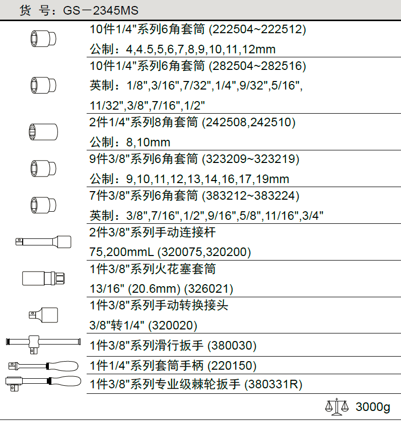 天赋工具1/4",3/8"系列 45件套公英制混合套筒扳手组GS-2345MS