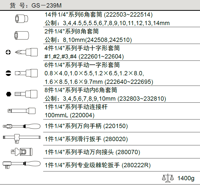 天赋工具1/4"系列 39件套公制多组合套筒扳手组GS-239M