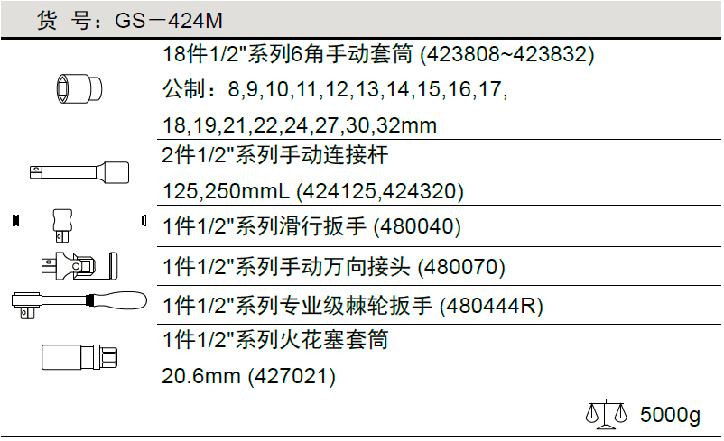 天赋工具1/2"系列 24件套6角公制套筒扳手组GS-424M