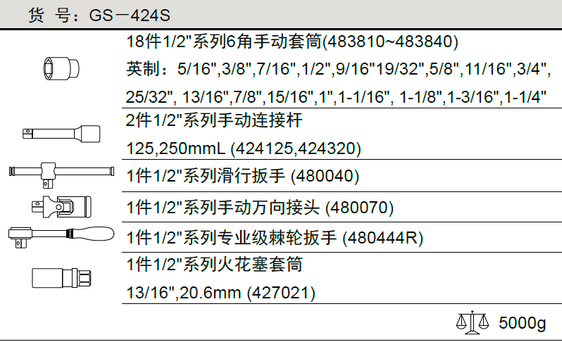 1/2"系列 24件套6角英制套筒扳手组GS-424S