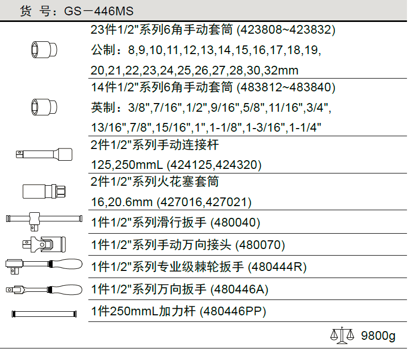 天赋工具1/2"系列 46件套公英制混合套筒扳手组GS-446MS