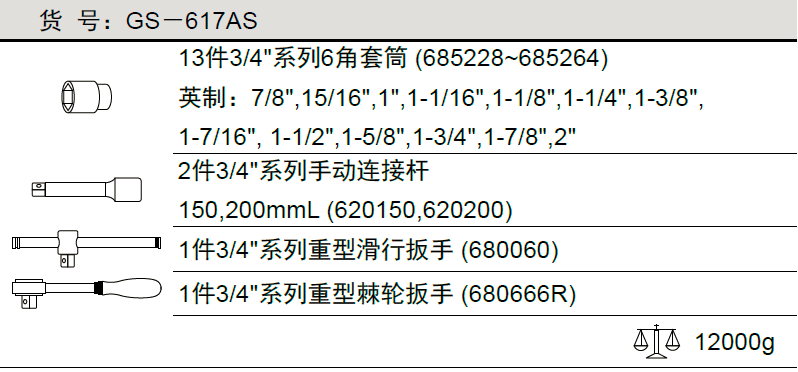 天赋工具3/4"系列17件套英制重型套筒扳手组GS-617AS