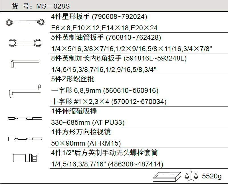 天赋工具28件套英制星形,油管和内6角扳手组MS-028S