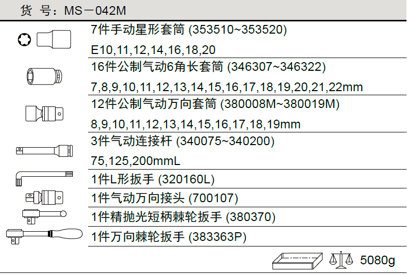 天赋工具3/8"系列 42件套公制星形套筒、气动套筒和附件组MS-042M