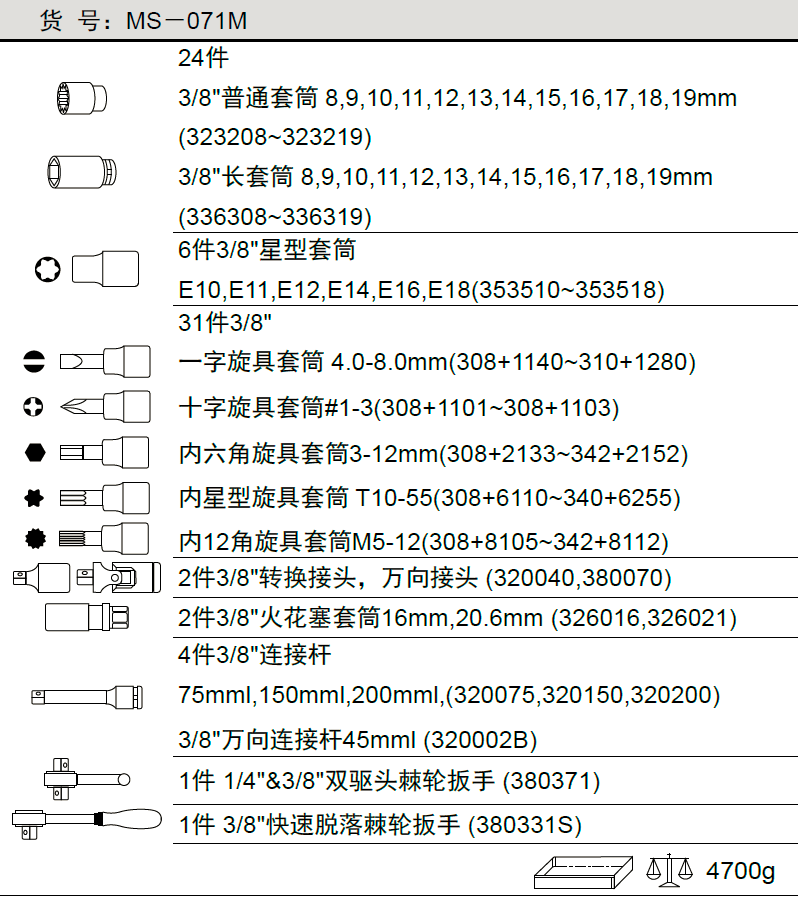 天赋工具3/8"系列71件套公制综合旋具套筒和手动套筒扳手组MS-071M