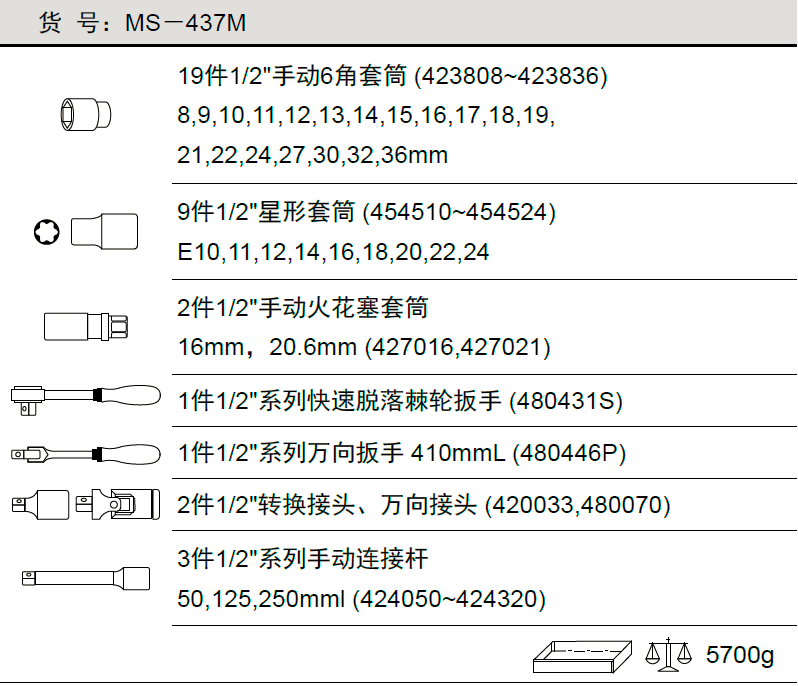 天赋工具1/2"系列 37件套公制手动套筒和扳手组MS-437M