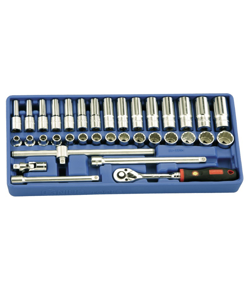 天赋工具35件公制手动套筒及扳手组EU-335M内包含手动套筒为铬钒钢材质,硬度高,耐磨耐腐蚀,表面抛光电镀,防腐防锈,更加耐用。圆弧内角设计,强劲锁定,减少磨损。天赋工具Geniustools蓝色托盘套装,适合工具车摆放尺寸,每个凹槽摆放对应规格型号工具,高效收纳,存取方便,不易丢失。广泛应用于各类机修装配、汽修、电力,石油,矿产等领域的设备维护。具体规格参数如下: