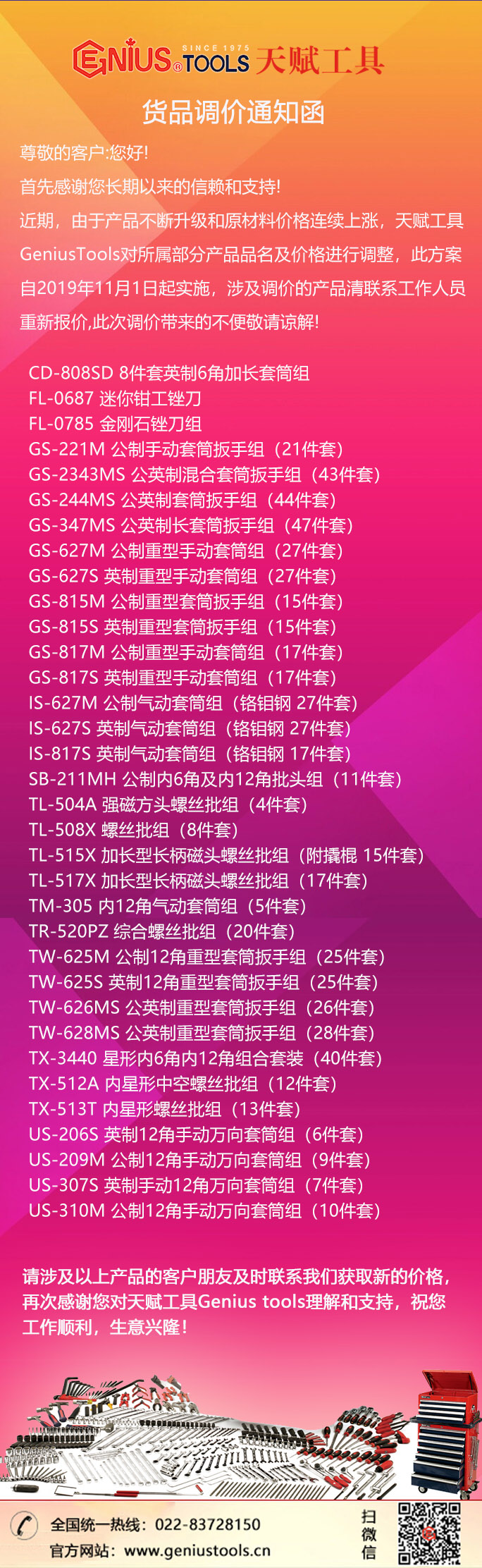 请涉及以上产品的客户朋友及时联系我们获取新的价格,再次感谢您对天赋工具Genius tools理解和支持,祝您工作顺利,生意兴隆!