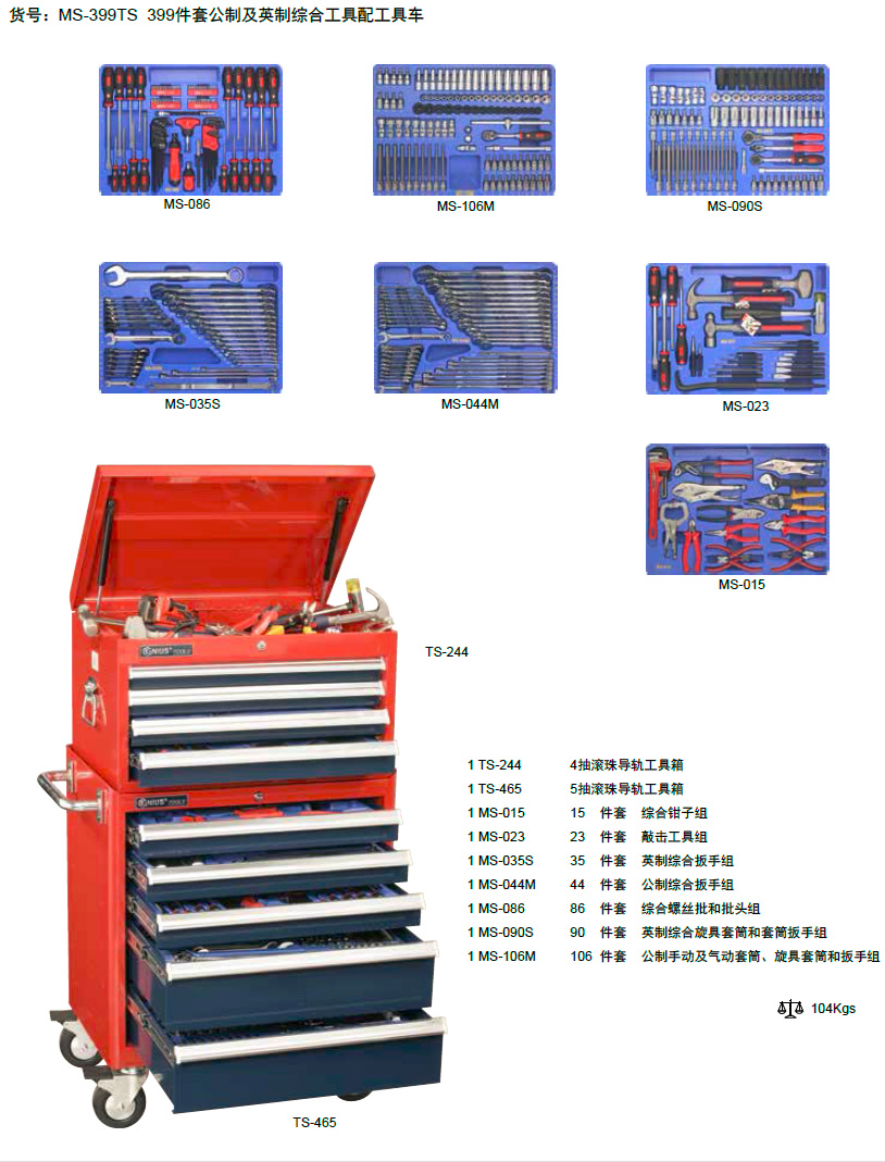 工具车-天赋工具399件套公制及英制综合工具配工具车MS-399TS,MS-399TS为天赋工具Geniustools原装进口工具车,配套399件套综合工具组,适合汽车维修,机械制造,石油化工,造船,铁路,电力等多种行业使用,天赋工具Geniustools品牌工具车采用加厚不锈钢材质,坚固耐用,钢制轨道,承重力强,静音车轮,推拉轻松灵活,欢迎选购:022-83728150。