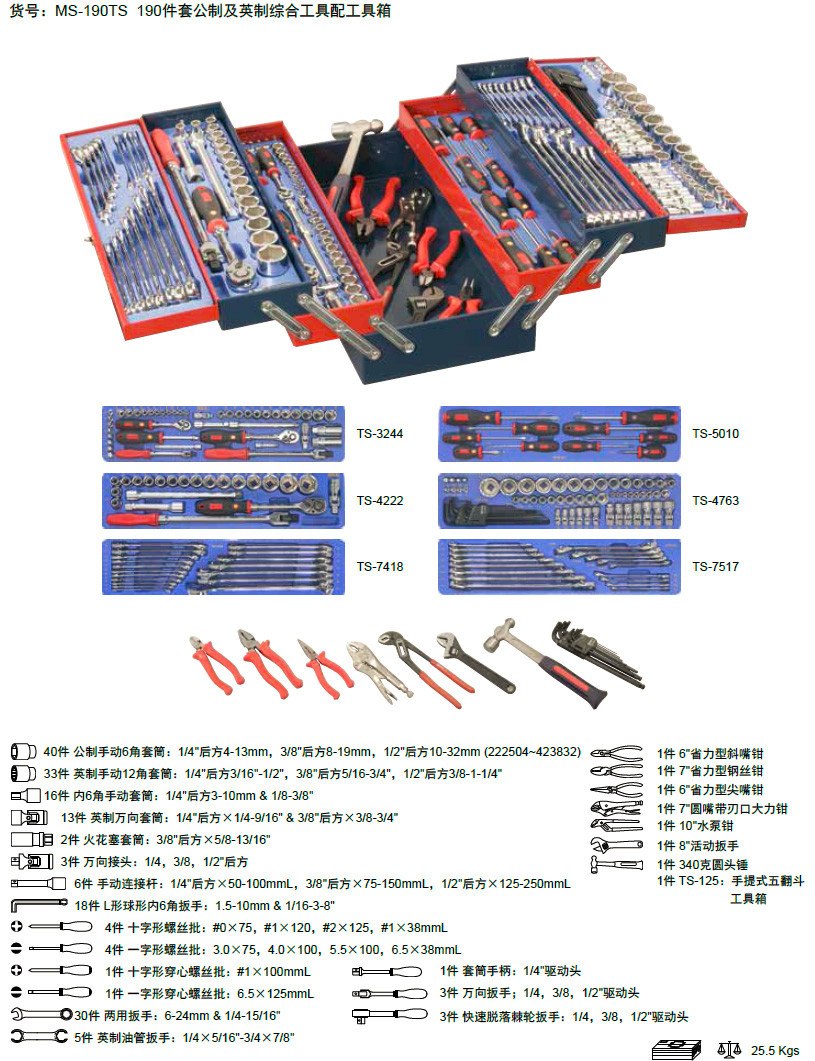 货号:MS-190TS 190件套公制及英制综合工具箱