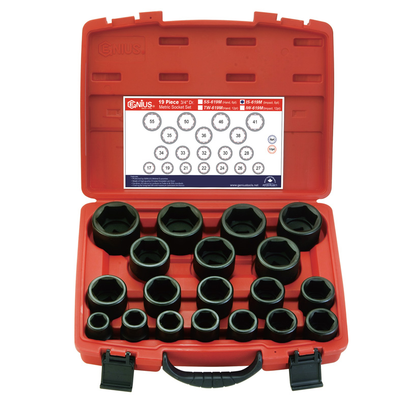 天赋工具 Geniustools3/4" 系列19件套公制气动套筒组IS-619M ,内包含气动套筒为铬钼钢材质,电脑控制“真空”热处理,深度淬火,硬度高,耐磨耐腐蚀,表面炭黑磷化,防腐防锈。圆弧内角设计,减少磨损。天赋工具红色塑箱套装 ,每个凹槽摆放对应规格型号工具,快速收纳,存取方便,不易丢失。广泛应用于各类机修装配、汽修、电力,石油,矿产等领域的设备维护。具体规格参数如下: