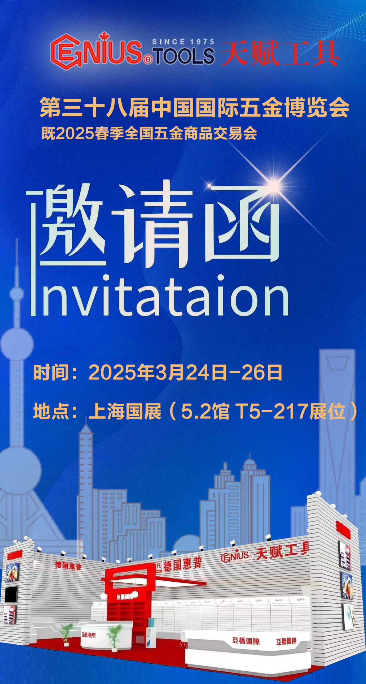 天赋工具Geniustools诚挚地邀请您参加第三十八届中国国际五金博览会既2025春季全国五金商品交易会。本次博览会将于2025年3月24日至26日在国家会展中心(位于虹桥机场附近,地铁2号线徐泾东路站下)盛大举行。作为五金行业的盛会,博览会将汇聚全球五金行业的知名品牌,共同探讨行业前沿趋势,展示最新技术与产品。