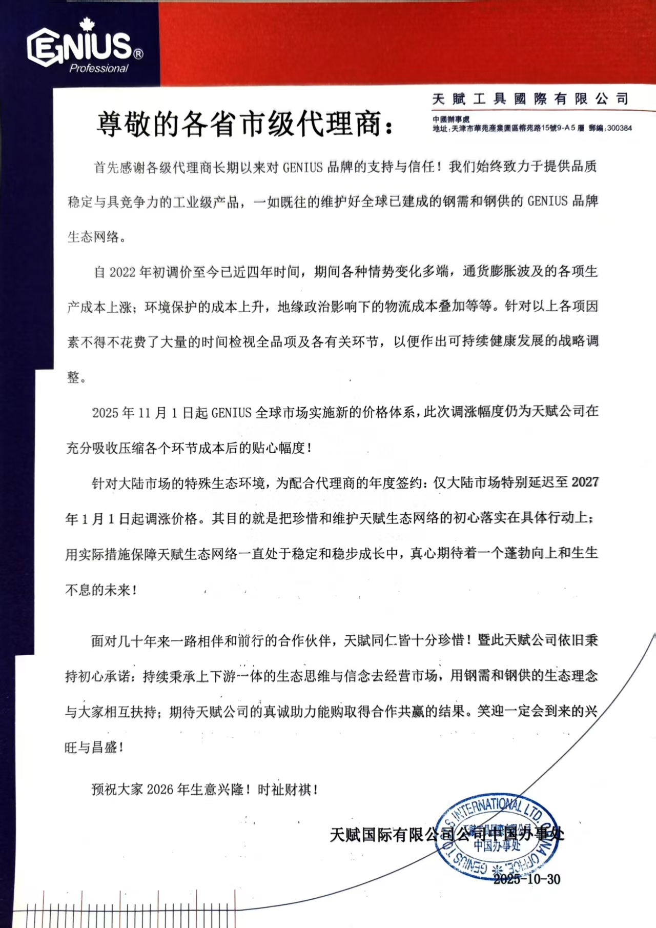 2025111日起GENIUS全球市场实施新的价格体系,此次调涨幅度仍为天赋工具在充分吸收压缩各个环节成本后的贴心幅度!