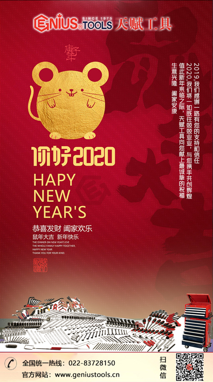 天赋工具Geniustools祝您元旦快乐 Tue Dec, 2019 2019年,天赋工具Geniustools感谢一-路有您的支持和信任2020年,我们将一如既往兢兢业业,与您携手共创辉煌值此新年来临之际,天赋工具Geniustools全体同仁向您献上最诚挚的祝福祝您生意兴隆,阖家安康!