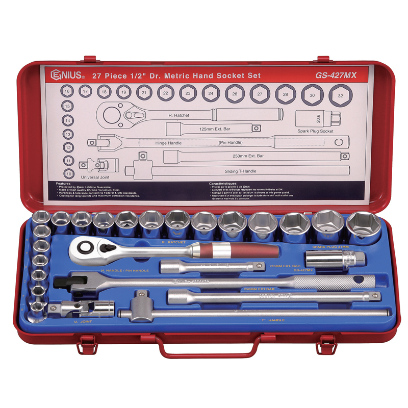 天赋工具 Geniustools 1/2"系列27件英制手动12角套筒扳手组TW-427SX,内包含手动套筒为铬钒钢材质,硬度高,耐磨耐腐蚀,表面抛光电镀,防腐防锈。圆弧内角设计,减少磨损。天赋工具红色金属箱套装 ,每个凹槽摆放对应规格型号工具,快速收纳,存取方便,不易丢失。广泛应用于各类机修装配、汽修、电力,石油,矿产等领域的设备维护。具体规格参数如下: