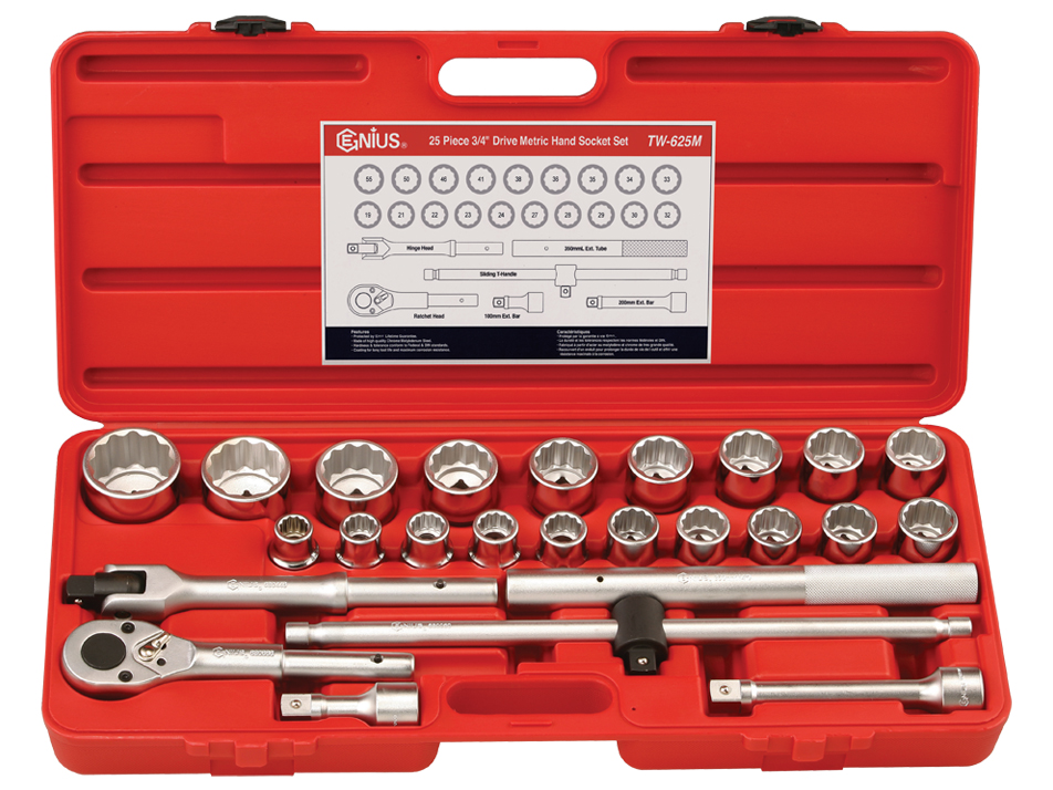 天赋工具25件公制重型12角套筒扳手组TW-625M,内含3/4"重型19mm系列英制6角套筒19件,内含1件3/4"系列重型棘轮扳手和重型滑行扳手各1件,订购电话:022-83728150