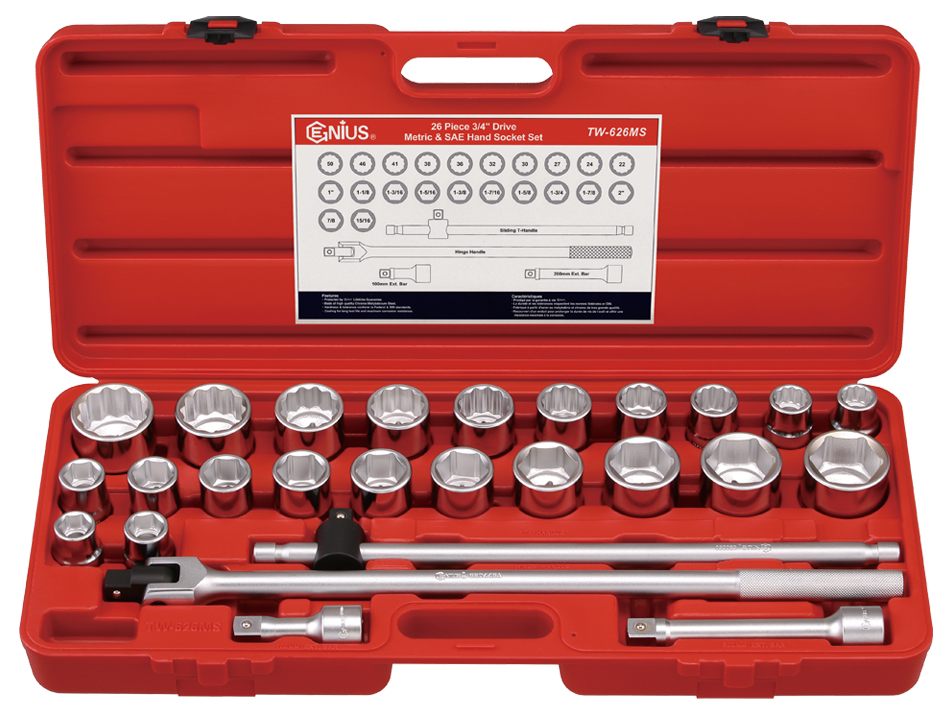 天赋工具3/4"系列 26件套公英制重型套筒扳手组TW-626MS,内含3/4"重型19mm系列公制12角套筒10件,英制6角套筒12件,内含1件3/4"系列重型万向扳手和重型滑行扳手各1件,订购电话:022-83728150
