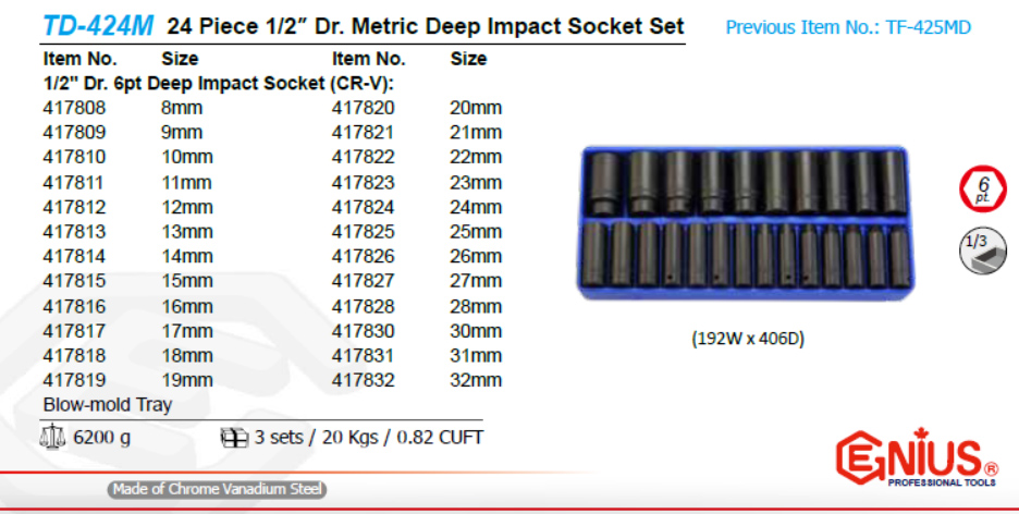 | TD-424M | 公制气动长套筒组(24件套) | 1/2″ | 套 | 6200g | 3天 |