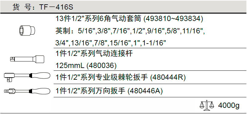 1/2"系列 16件套气动英制套筒扳手组TF-416S