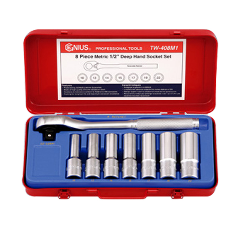 天赋工具8件套12角公制长套筒扳手组TW-408M1,内包含手动套筒为铬钒钢材质,硬度高,耐磨耐腐蚀,表面抛光电镀,防腐防锈,更加耐用。圆弧内角设计,强劲锁定,减少磨损。天赋工具红色手提式金属盒套装,每个凹槽摆放对应规格型号工具,高效收纳,存取方便,不易丢失。广泛应用于各类机修装配、汽修、电力,石油,矿产等领域的设备维护。具体规格参数如下:
