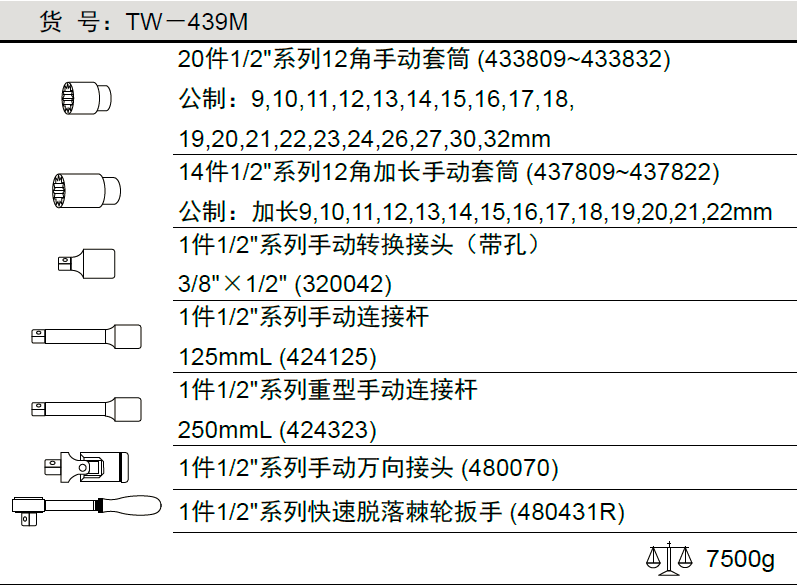 1/2"系列 39件套12角公制套筒扳手组TW-439M
